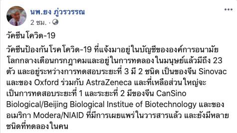 วัคซีนป้องกันโรคโควิด-19 ที่แจ้งมาอยู่ในบัญชีขององค์การอนามัยโลกกลางเดือนกรกฎาคมและอยู่ในการทดลองในมนุษย์แล้วมีถึง 23 ตัว และอยู่ระหว่างการทดสอบระยะที่ 3 มี 2 ชนิด เป็นของจีน Sinovac และของ Oxford ร่วมกับ AstraZeneca และที่เหลือส่วนใหญ่จะเป็นการทดสอบระยะที่ 1 และระยะที่ 2 มีของจีน CanSino Biological/Beijing Biological Institue of Biotechnology และของอเมริกา Modera/NIAID ที่มีการเผยแพร่ในวารสารแล้ว และยังมีหลายชนิดที่ทดลองในคน