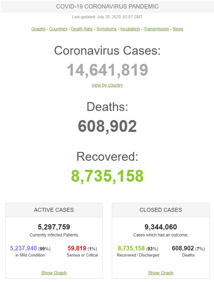https://www.facebook.com/tnamcot/photos/pcb.2975324535904999/2975324195905033/?type=3&theater Total Page Visits: 1563 - Today Page Visits: 1 แนะแนวเรื่อง สถานการณ์ทั่วโลก วันที่ 19 กรกฎาคม 2563, เวลา 10:30 น. – ผู้ป่วยยืนยัน 14,425,865 ราย – กลับบ้านแล้ว 8,612,194 ราย – ยังรักษาใน รพ. 5,208,754 ราย – เสียชีวิต 604,917 ราย #ไทยรู้สู้โควิด โควิดโลก14.6ล.! ‘ฝรั่งเศส’ บังคับ ปชช. ใส่หน้ากากปรับ4.8 พัน- ‘แจ็ค นิคลอส’ ติดเชื้อด้วย #สำนักข่าวอิศรา