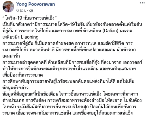 ข้อมูลที่มีอยู่ขณะนี้เป็นข้อเตือนใจการซื้ออาหารแช่แข็ง โดยเฉพาะที่มาจากต่างประเทศ การจับต้อง การเตรียมอาหารจะต้องล้างมือให้สะอาด ไม่จับต้องใบหน้า ระวังสัมผัสกับอาหารอื่น ควรบริโภคสุก ป้องกันไว้ก่อนเพื่อกันการระบาด เชื้ออาจจะมากับอาหารแช่แข็ง และเชื้อจะอยู่ได้ตลอดการแช่แข็ง