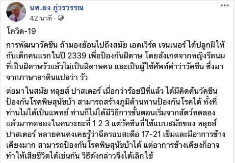 วัคซีนโควิด-19นี้ สามารถรู้ผลได้ภายในสิ้นปีนี้ ก็ถือว่าทำเร็วกว่าปกติเป็น 10 เท่าทีเดียว จะเป็นการสร้างประวัติศาสตร์การผลิตวัคซีน ในอดีตการคิดค้นวัคซีนจะใช้บุคคลคนเดียวหรือกลุ่มเล็ก