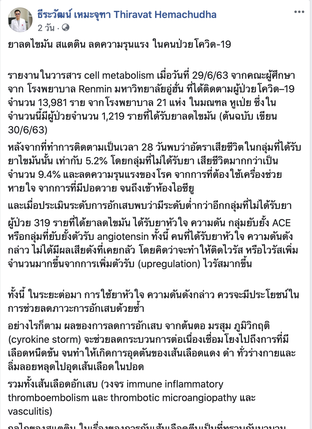 รายงานในวารสาร cell metabolism เมื่อวันที่ 29/6/63 จากคณะผู้ศึกษาจาก โรงพยาบาล Renmin มหาวิทยาลัยอู่ฮั่น ที่ได้ติดตามผู้ป่วยโควิด–19 จำนวน 13,981 ราย จากโรงพยาบาล 21 แห่ง ในมณฑล หูเป่ย ซึ่งในจำนวนนี้มีผู้ป่วยจำนวน 1,219 รายที่ได้รับยาลดไขมัน (ต้นฉบับ เขียน 30/6/63)
