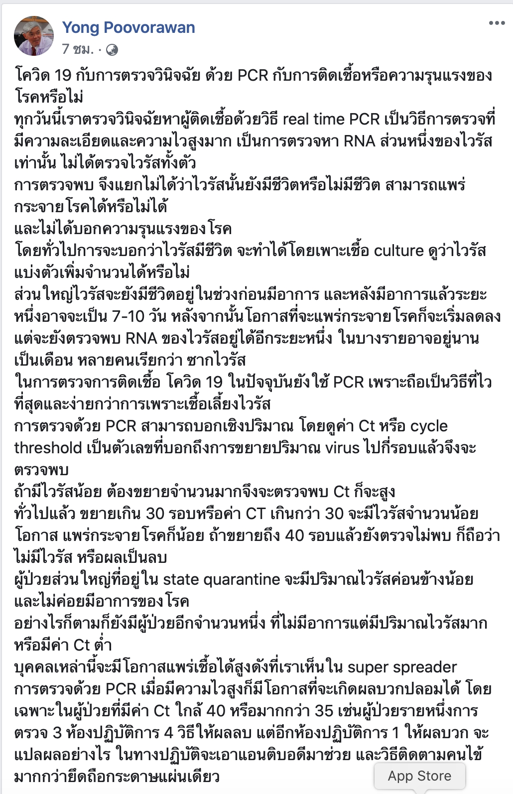 ทั่วไปแล้ว ขยายเกิน 30 รอบหรือค่า CT เกินกว่า 30 จะมีไวรัสจำนวนน้อยโอกาส แพร่กระจายโรคก็น้อย ถ้าขยายถึง 40 รอบแล้วยังตรวจไม่พบ ก็ถือว่าไม่มีไวรัส หรือผลเป็นลบ