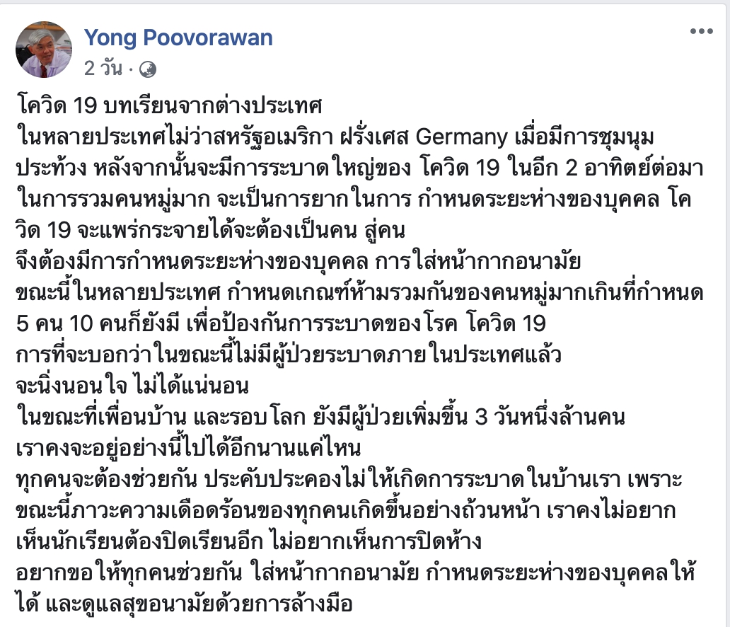 อยากขอให้ทุกคนช่วยกัน ใส่หน้ากากอนามัย กำหนดระยะห่างของบุคคลให้ได้ และดูแลสุขอนามัยด้วยการล้างมือ