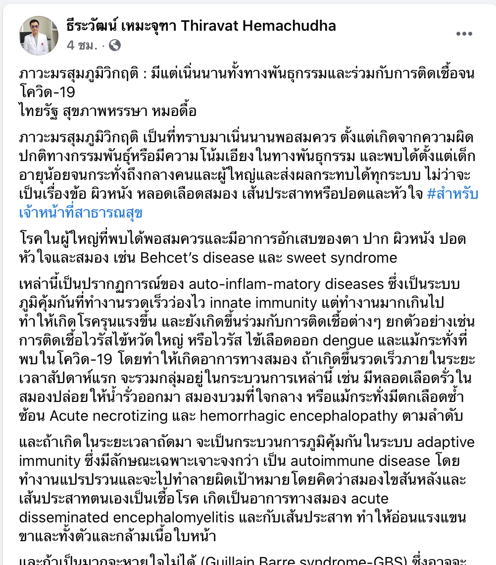 เหล่านี้เป็นปรากฏการณ์ของ auto-inflam-matory diseases ซึ่งเป็นระบบภูมิคุ้มกันที่ทำงานรวดเร็วว่องไว innate immunity แต่ทำงานมากเกินไป ทำให้เกิดโรครุนแรงขึ้น และยังเกิดขึ้นร่วมกับการติดเชื้อต่างๆ ยกตัวอย่างเช่น การติดเชื้อไวรัสไข้หวัดใหญ่ หรือไวรัส ไข้เลือดออก dengue และแม้กระทั่งที่พบในโควิด-19 โดยทำให้เกิดอาการทางสมอง ถ้าเกิดขึ้นรวดเร็วภายในระยะเวลาสัปดาห์แรก จะรวมกลุ่มอยู่ในกระบวนการเหล่านี้ เช่น มีหลอดเลือดรั่วในสมองปล่อยให้น้ำรั่วออกมา สมองบวมที่ใจกลาง หรือแม้กระทั่งมีตกเลือดซ้ำซ้อน Acute necrotizing และ hemorrhagic encephalopathy ตามลำดับ