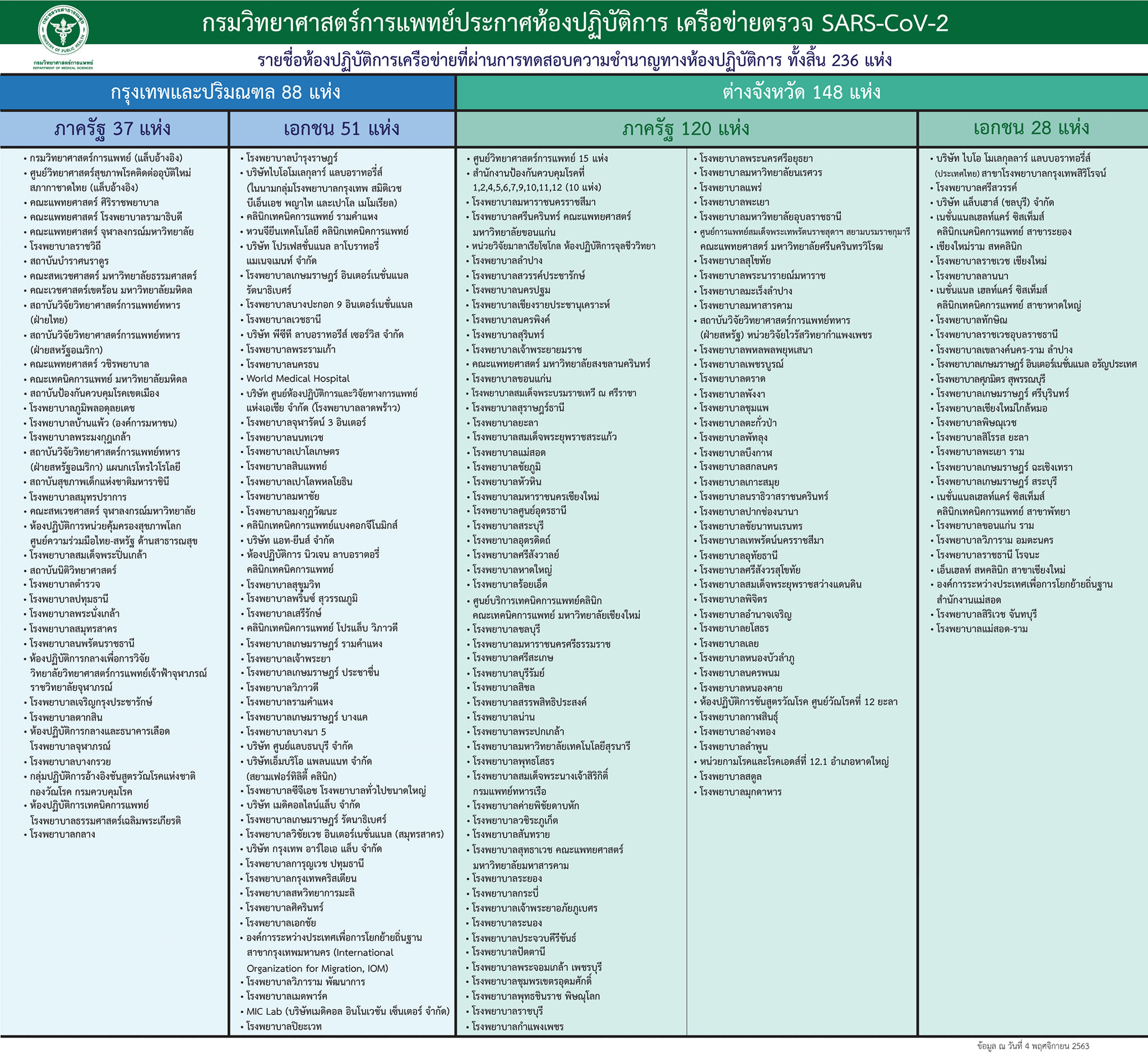 Notice: Trying to get property 'geoplugin_countryCode' of non-object in /home/thainapci/domains/thainapci.org/public_html/2021/wp-content/plugins/page-visit-counter/public/class-page-visit-counter-public.php on line 227 กรมวิทยาศาสตร์การแพทย์ ประกาศห้องปฏิบัติการเครือข่ายตรวจ SAR-CoV-2 (ข้อมูล ณ วันที่ 4 พฤศจิกายน 2563) ดูรูปใหญ่ได้ที่ >>https://bit.ly/2HUemlL – สมาคมพยาบาลด้านการป้องกันและควบคุมโรคติดเชื้อ(สพปร.)