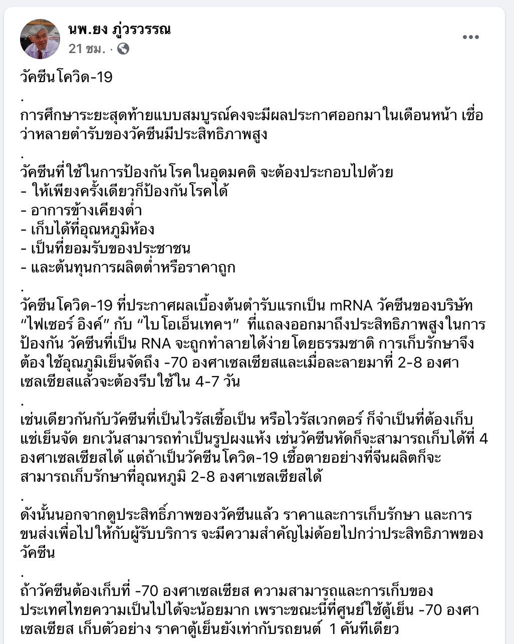 ถ้าวัคซีนต้องเก็บที่ -70 องศาเซลเซียส ความสามารถและการเก็บของประเทศไทยความเป็นไปได้จะน้อยมาก เพราะขณะนี้ที่ศูนย์ใช้ตู้เย็น -70 องศาเซลเซียส เก็บตัวอย่าง ราคาตู้เย็นยังเท่ากับรถยนต์ 1 คันทีเดียว