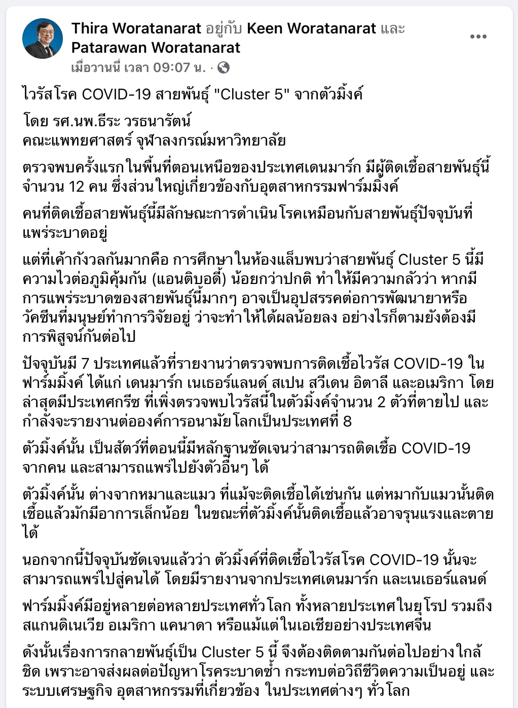 ดังนั้นเรื่องการกลายพันธุ์เป็น Cluster 5 นี้ จึงต้องติดตามกันต่อไปอย่างใกล้ชิด เพราะอาจส่งผลต่อปัญหาโรคระบาดซ้ำ กระทบต่อวิถึชีวิตความเป็นอยู่ และระบบเศรษฐกิจ อุตสาหกรรมที่เกี่ยวข้อง ในประเทศต่างๆ ทั่วโลก