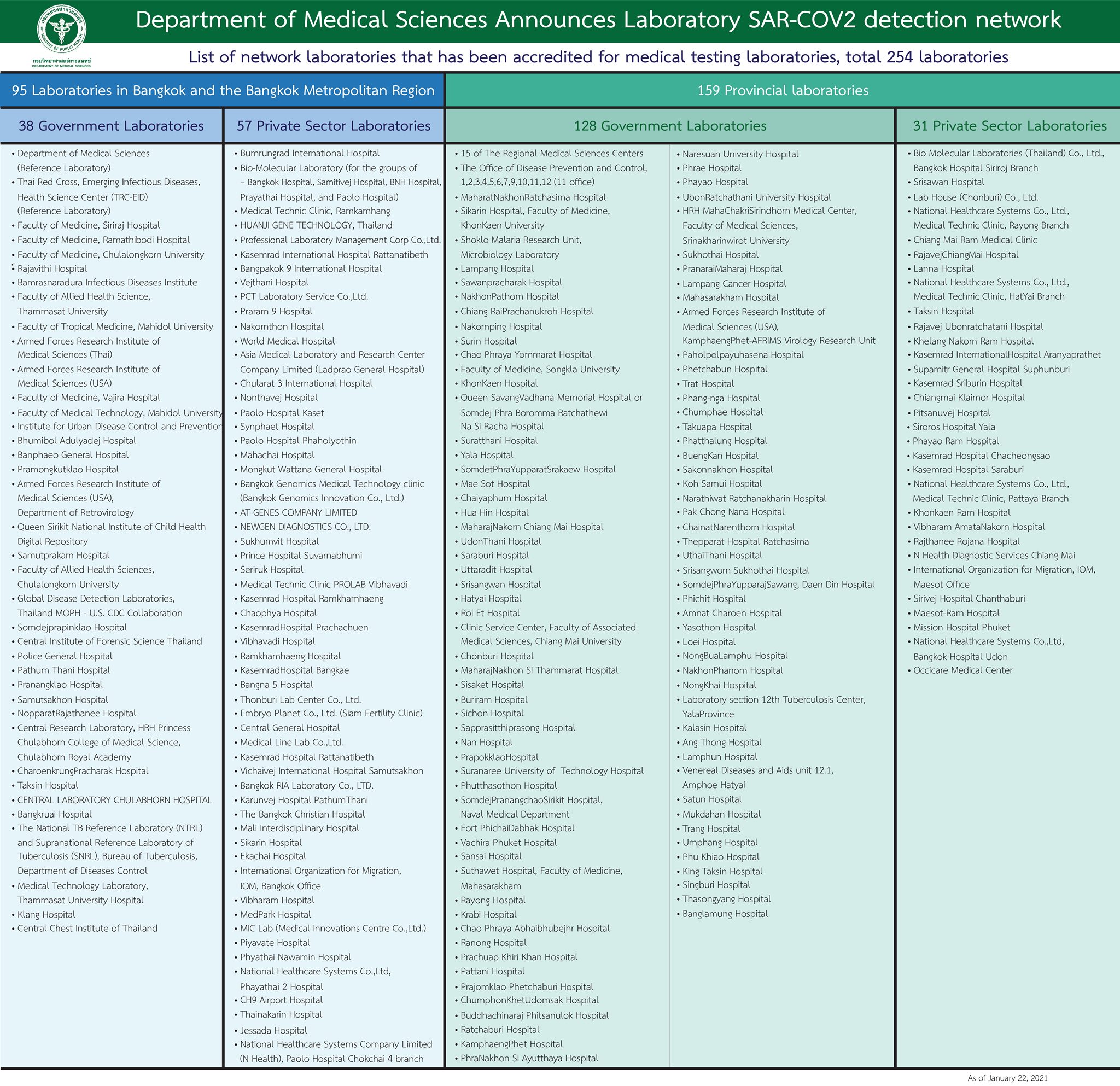 กรมวิทยาศาสตร์การแพทย์ ประกาศ ห้องปฏิบัติการเครือข่ายตรวจ SAR-CoV-2 (ข้อมูล ณ วันที่ 22 มกราคม 2564)