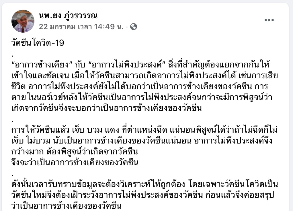 ดังนั้นเวลารับทราบข้อมูลจะต้องวิเคราะห์ให้ถูกต้อง โดยเฉพาะวัคซีนโควิดเป็นวัคซีนใหม่จึงต้องเฝ้าระวังอาการไม่พึงประสงค์ของวัคซีน ก่อนแล้วจึงค่อยสรุปว่าเป็นอาการข้างเคียงของวัคซีน