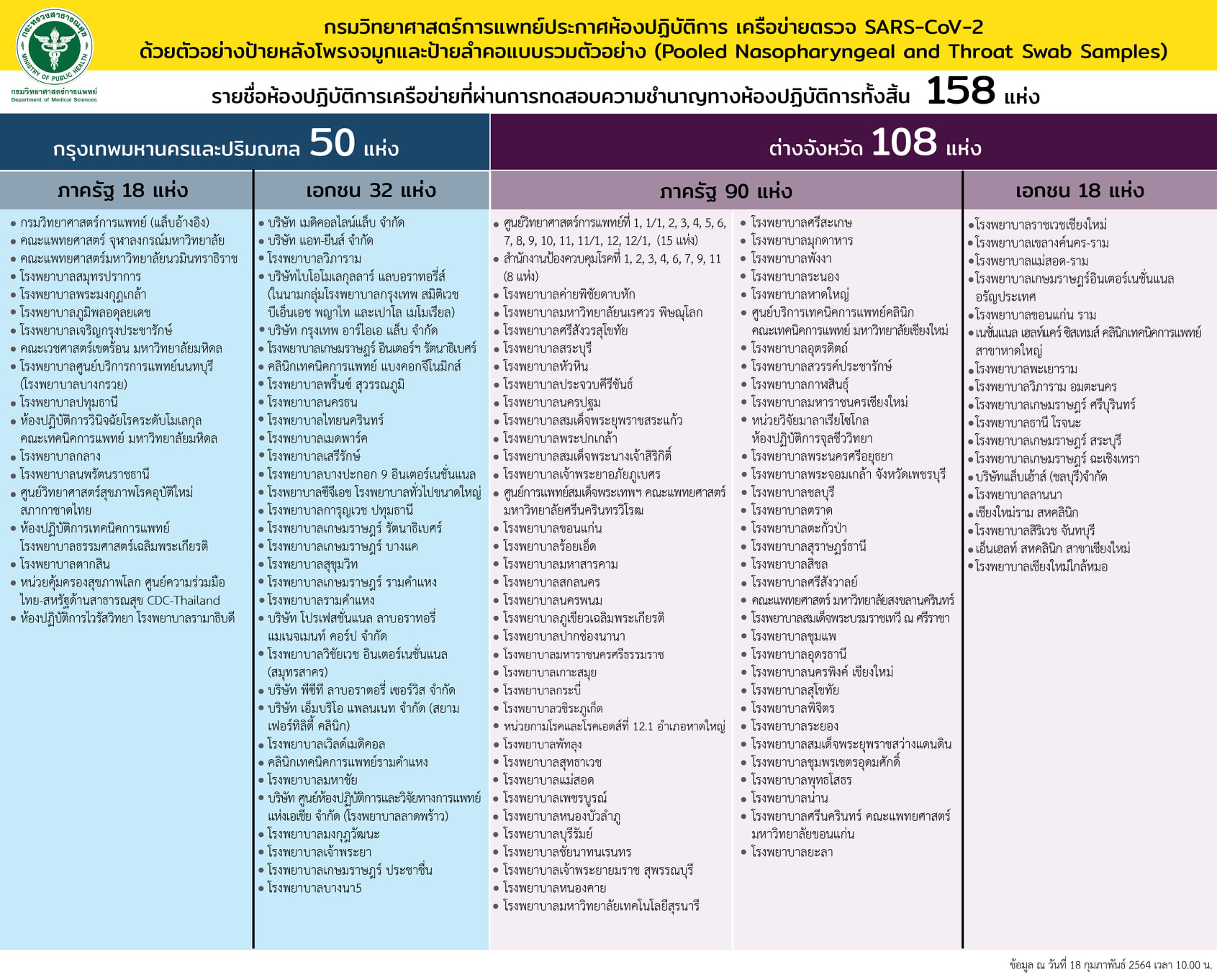 กรมวิทยาศาสตร์การแพทย์ประกาศห้องปฏิบัติการเครือข่ายตรวจ SARS-CoV-2 ด้วยตัวอย่างป้ายหลังโพรงจมูกและป้ายลำคอแบบรวมตัวอย่าง (Pooled Nasopharyngeal and Throat Swab Samples)