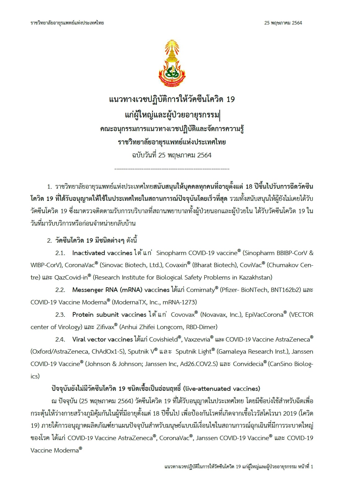 แนวทางเวชปฏิบัติการให้วัคซีนโควิด 19 แก่ผู้ใหญ่และผู้ป่วยอายุรกรรม