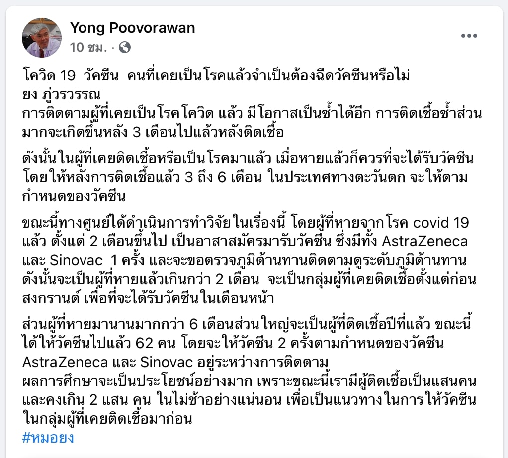 ขณะนี้ทางศูนย์ได้ดำเนินการทำวิจัยในเรื่องนี้ โดยผู้ที่หายจากโรค covid 19 แล้ว ตั้งแต่ 2 เดือนขึ้นไป เป็นอาสาสมัครมารับวัคซีน ซึ่งมีทั้ง AstraZeneca และ Sinovac 1 ครั้ง และจะขอตรวจภูมิต้านทานติดตามดูระดับภูมิต้านทาน ดังนั้นจะเป็นผู้ที่หายแล้วเกินกว่า 2 เดือน จะเป็นกลุ่มผู้ที่เคยติดเชื้อตั้งแต่ก่อนสงกรานต์ เพื่อที่จะได้รับวัคซีนในเดือนหน้า
